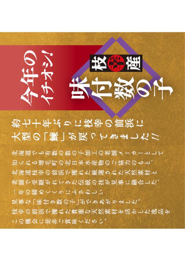 TOPいくら・筋子・その他加工食品 枝幸産70年ぶりの数の子(大/味付 200g×2袋入) 価格: ¥3,780 (税込) 販売期間: 数量: 個 在庫: ○ 在庫 ○ 返品についての詳細はこちら 約70年ぶりに枝幸の前浜に大型の「鰊」が戻ってきました!! 北海道でも有数の数の子加工の老舗メーカーとして知られる増毛町の北日本水産物のご協力のもと、北海道枝幸の前浜で獲れた厳選された天然素材と老舗で受け継がれてきた伝統の技が見事に融合した、1年の締めくくりにふさわしい見事な「味付き数の子」ができあがりました。枝幸の前浜で獲れた貴重な天然素材を活かした逸品をこの機会に是非ご賞味ください。 化粧箱入